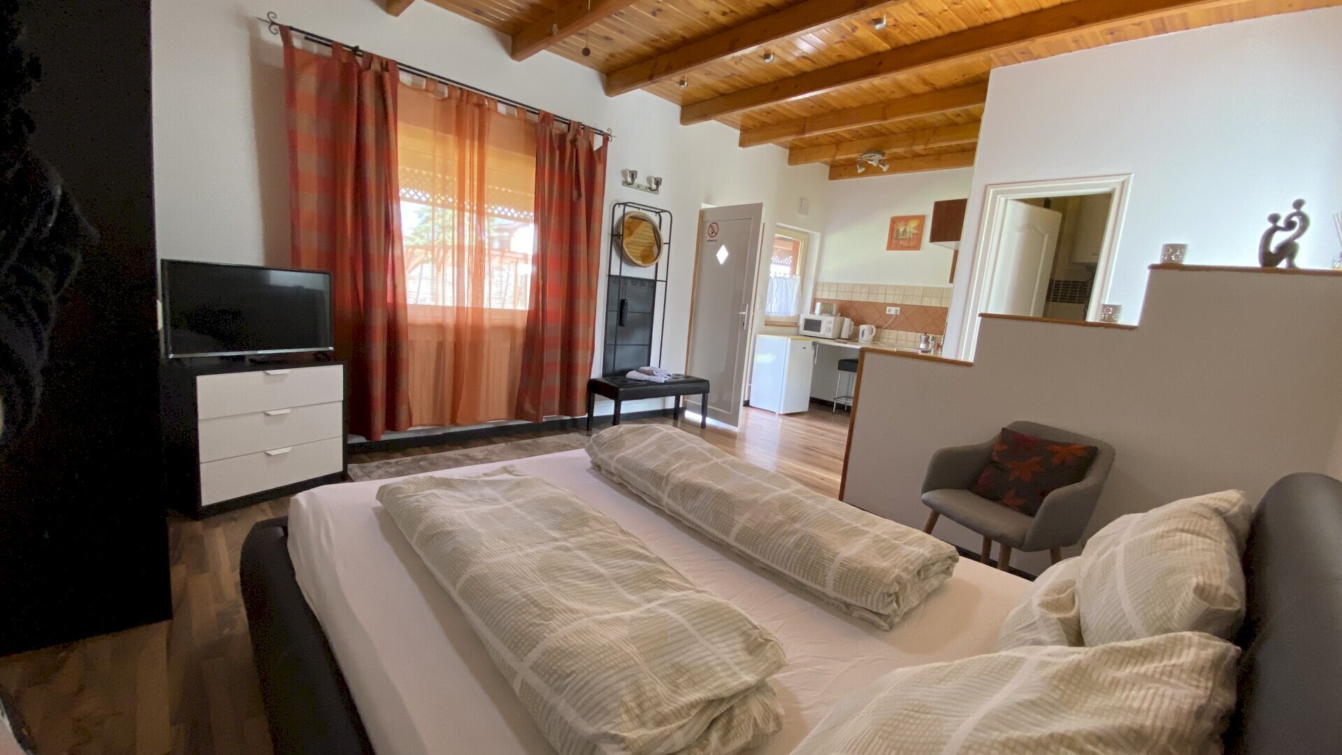 The apartments are fully equipped. The kitchen is fully equipped with microwave oven, toaster and kettle. The rooms are equipped with a refrigerator, heating, air conditioning, smart TV, Wi-fi, and a welcome drink.