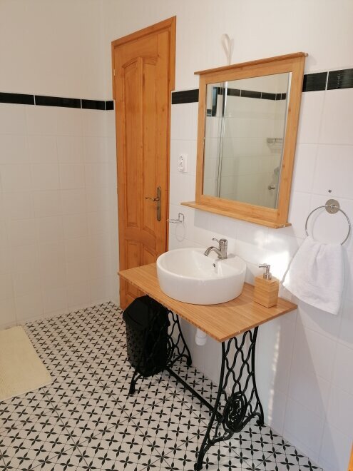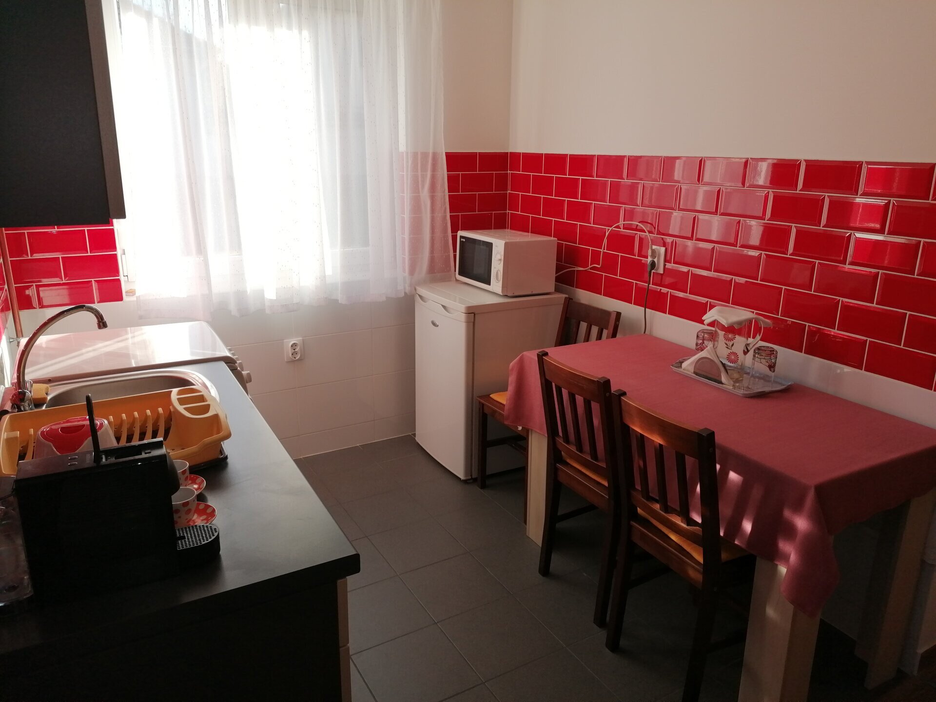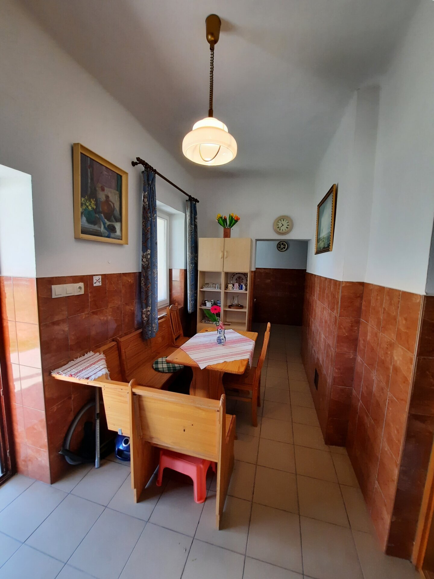 Upon entering the door, the dining room opens to the left, directly from here to the kitchen (gas stove, kettle, microwave, Nespresso and coffee machine, deep freezer refrigerator, toaster, kitchen utensils).