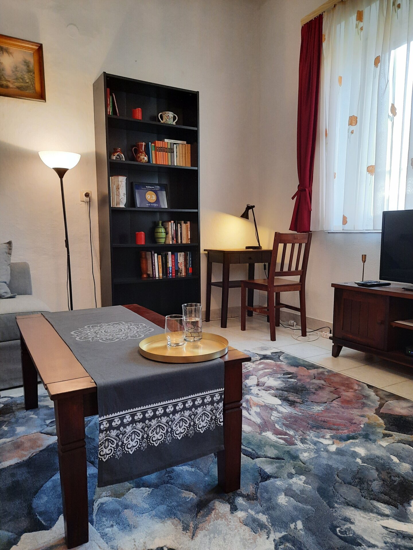 To the right of the entrance is the bathroom (bathtub, hairdryer) and toilet. Opposite the front door is the spacious living room, which has a pull-out couch, comfortable armchairs, and a flat-screen TV. The bedroom with a double bed opens to the right of the living room. The house is air-conditioned.