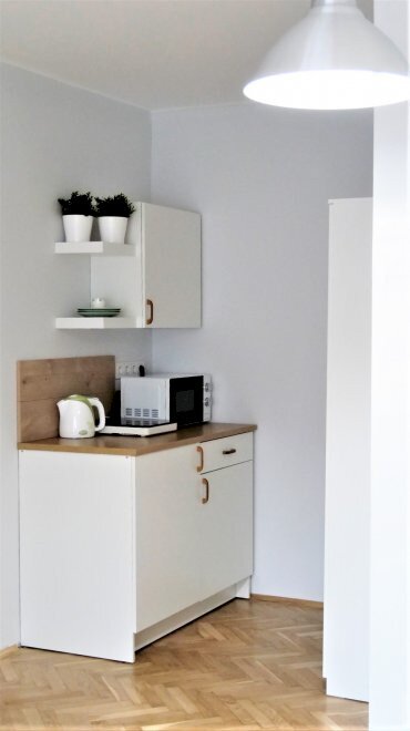 Kitchen equipment: microwave oven, refrigerator, kettle, hotplate.