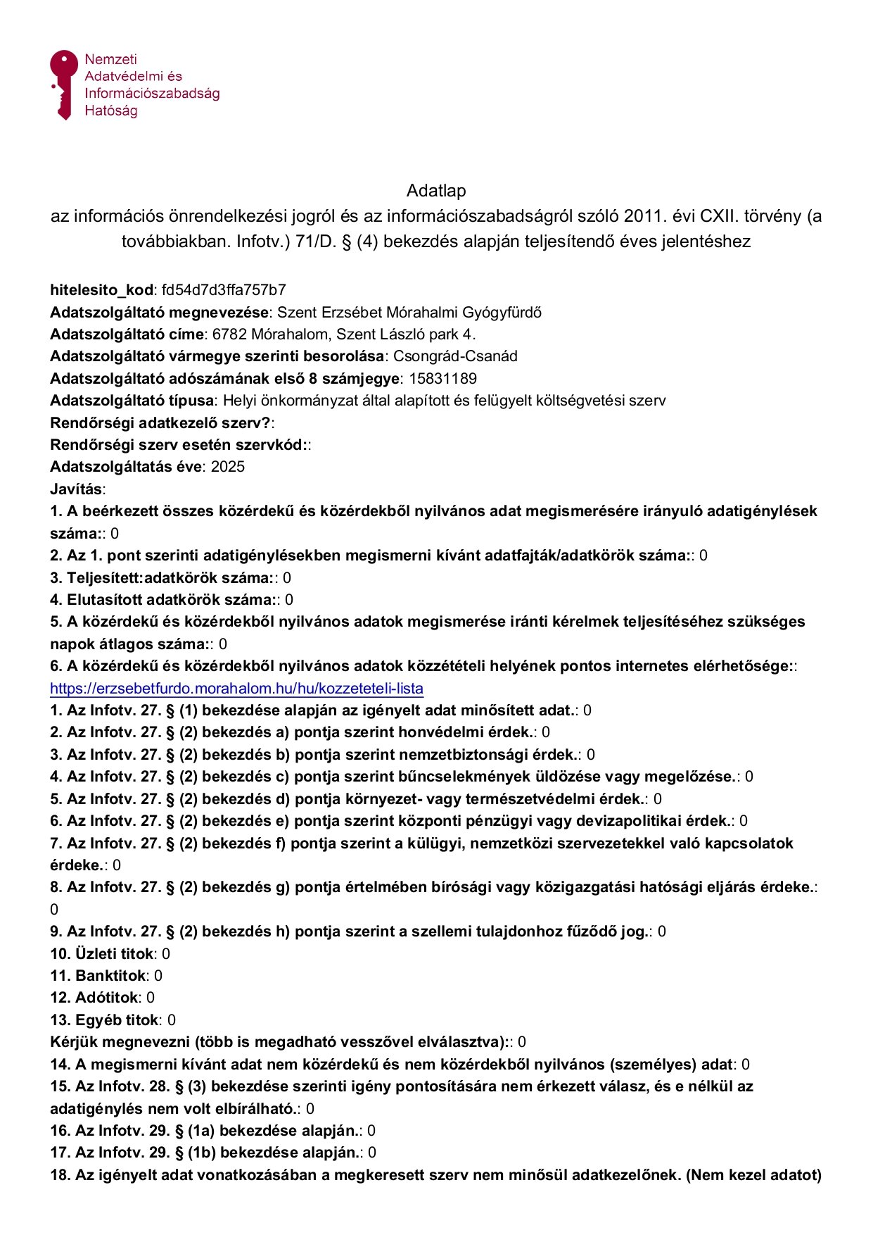 | 1. | A közfeladatot ellátó szerv hivatalos neve, székhelye, postai címe, telefon- és telefaxszáma, elektronikus levélcíme, honlapja, ügyfélszolgálatának elérhetőségei | Szent Erzsébet Mórahalmi Gyógyfürdő 6782 Mórahalom, Szent László Park 4.Tel: 62/281-039 furdo[at]morahalom [dot]hu |