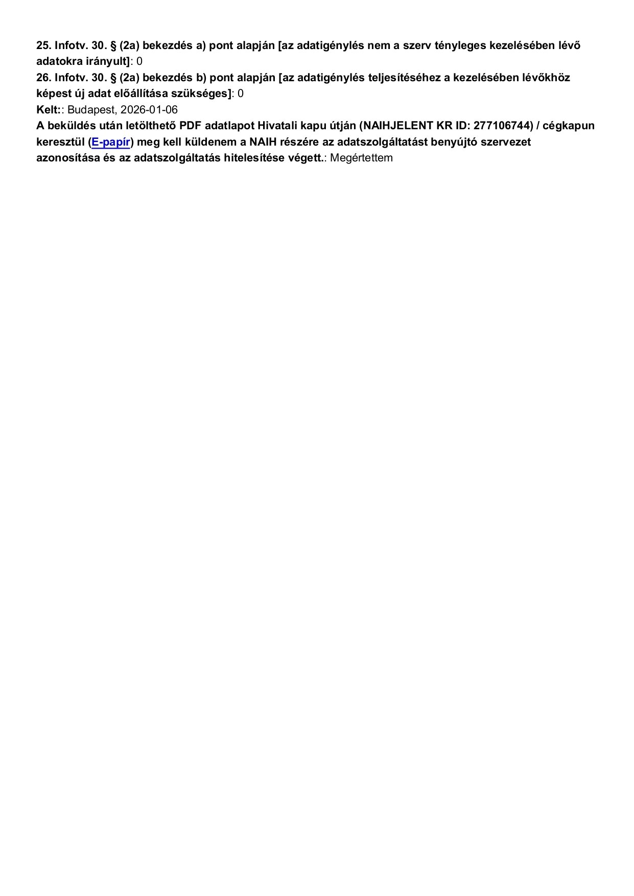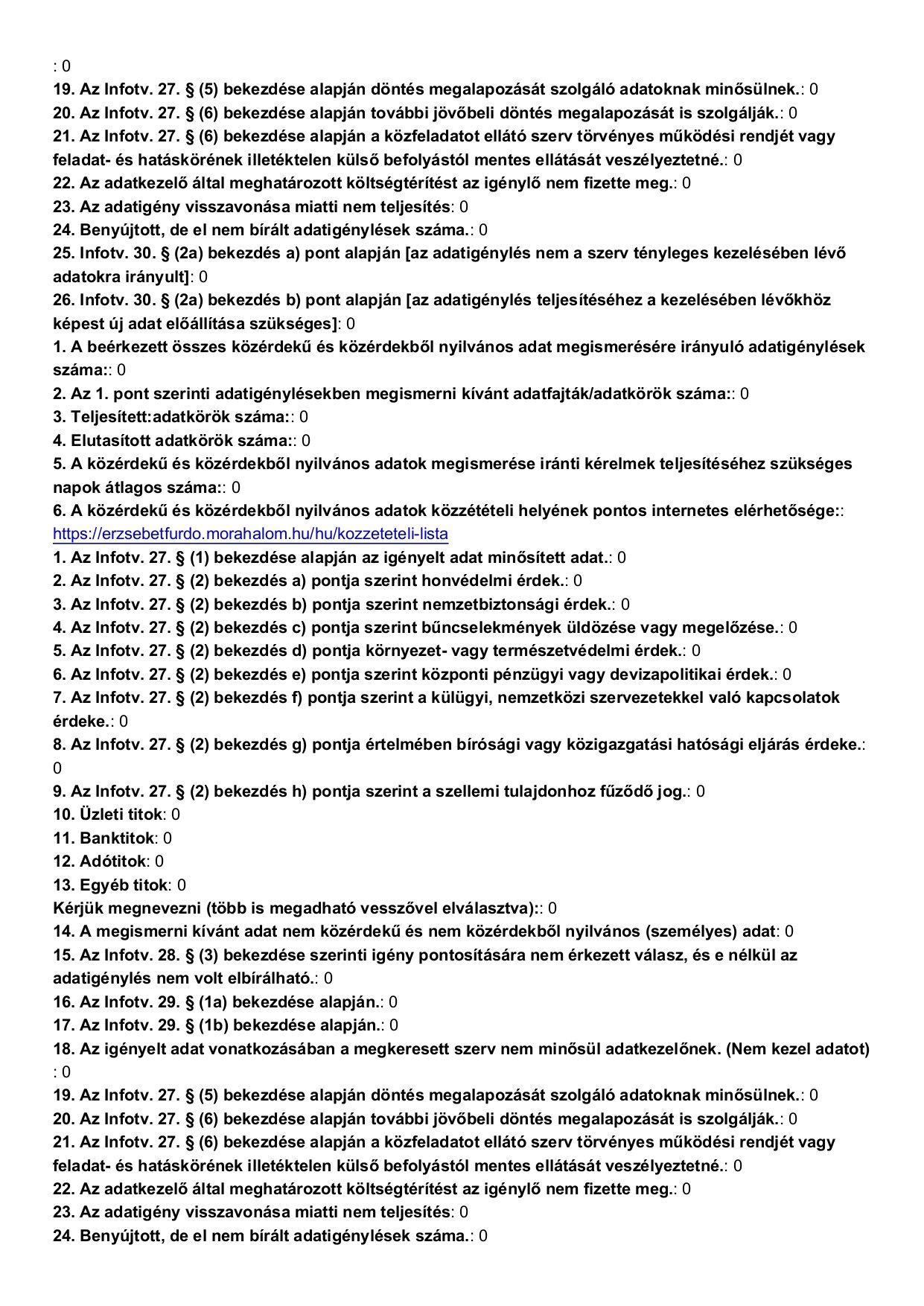 | 15. | A közérdekű adatokkal kapcsolatos kötelező statisztikai adatszolgáltatás adott szervre vonatkozó adatai | NAIH adatlap, 2023. évi jelentés |