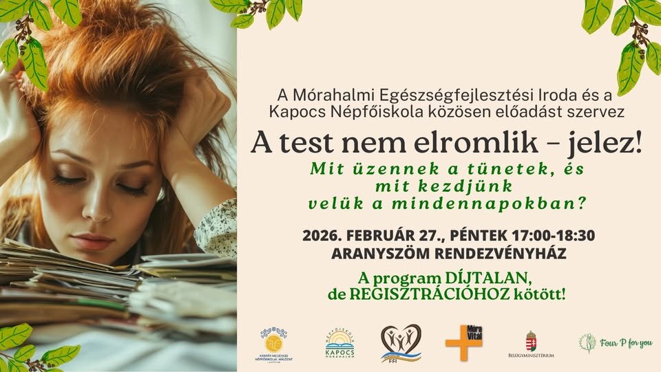 Szeretettel várunk minden érdeklődőt a Mórahalmi Egészségfejlesztési Iroda és a Kapocs Népfőiskola közös előadására a test és lélek egyensúlyával kapcsolatban