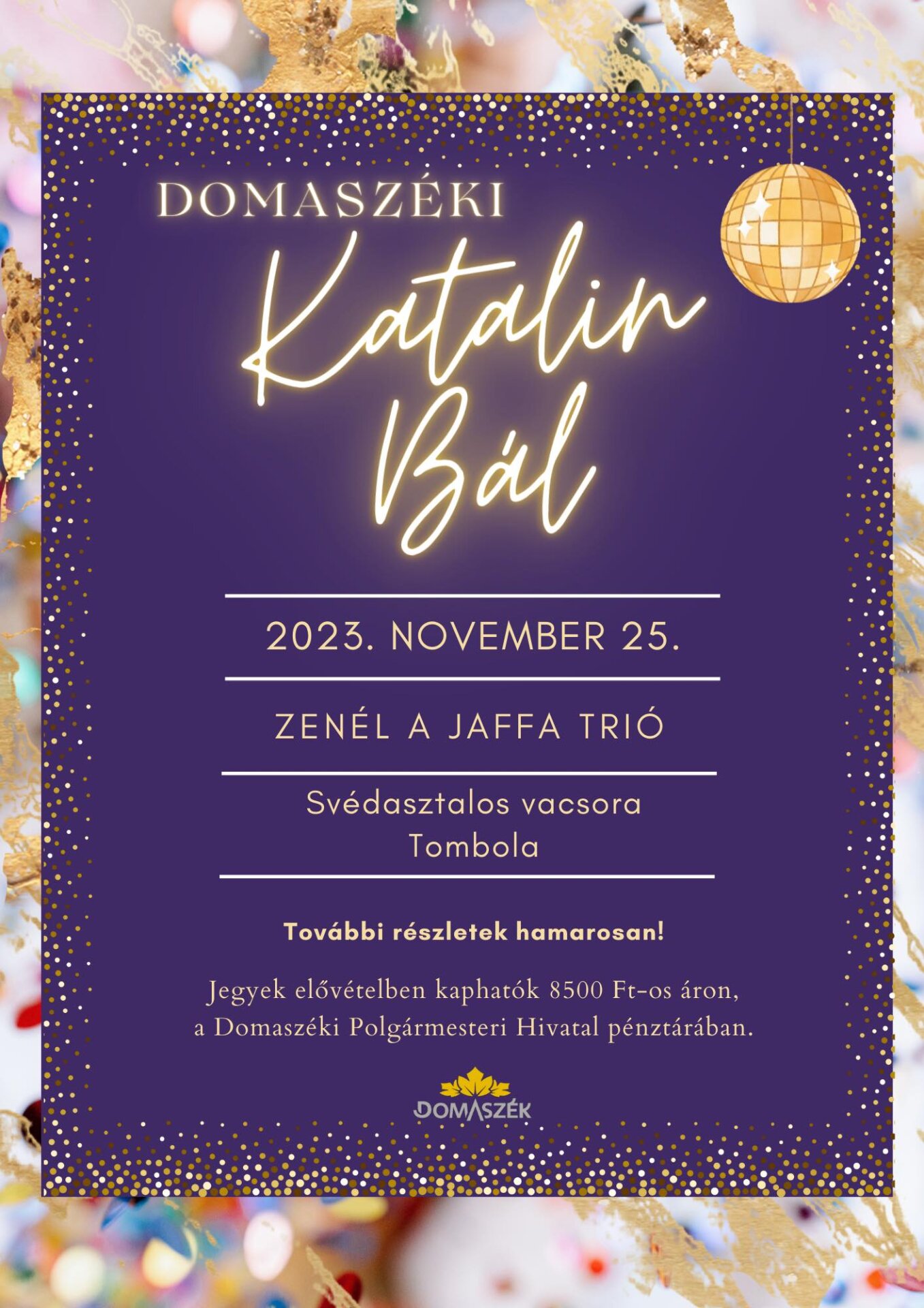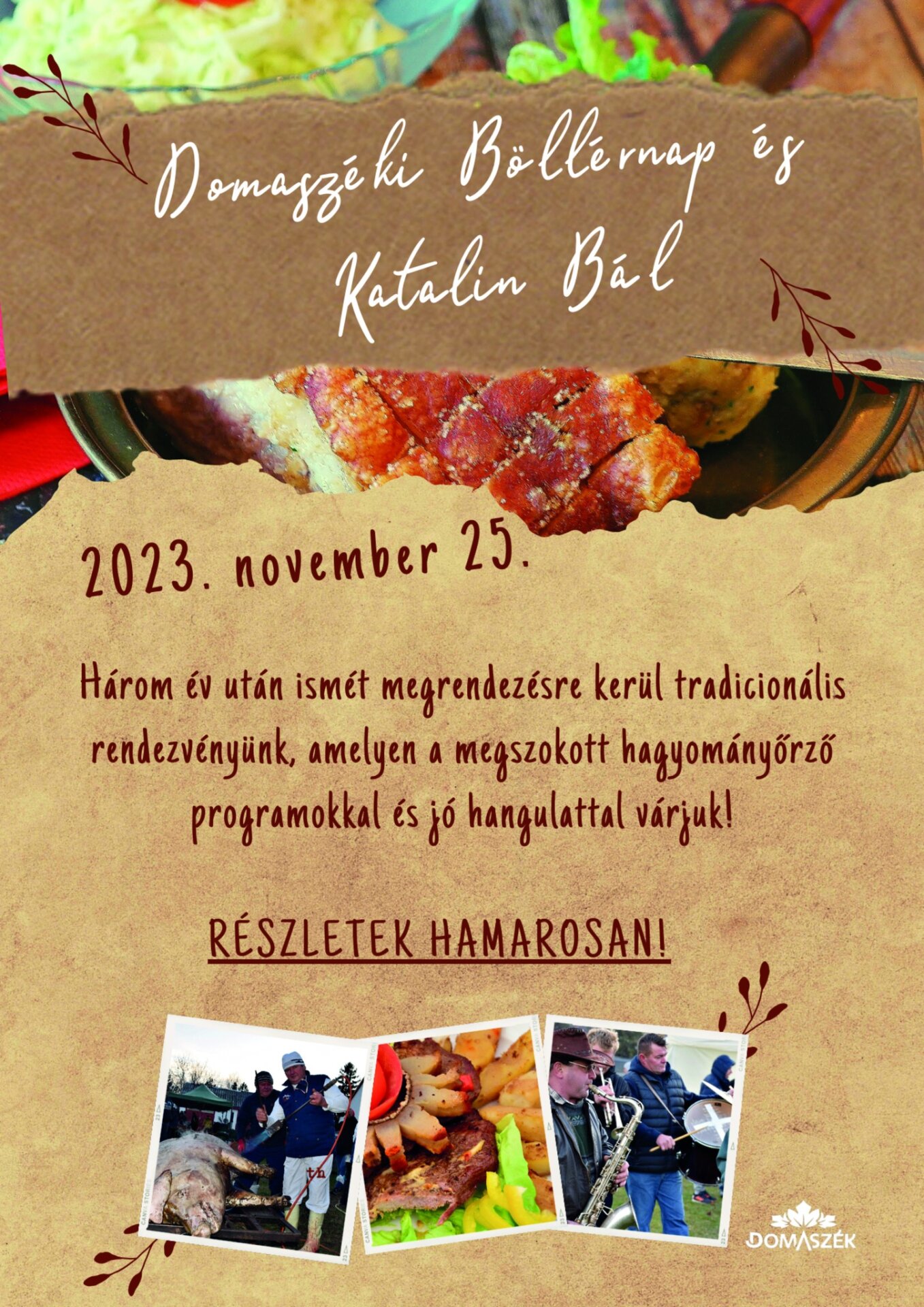2023. november 25. (szombat) - Reggel 7 órától 14 óráig böllérverseny a Köztársaság téren, este 18 órai kezdettel Katalin bál a Domaszéki Sportcsarnokban.