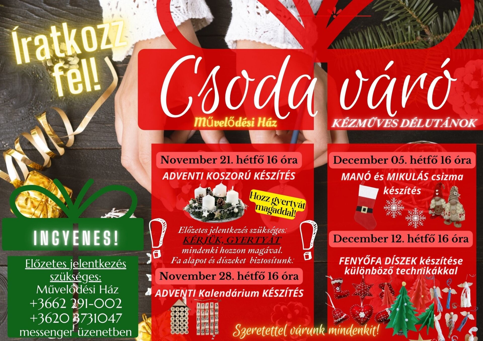 Szeretettel várunk mindenkit hétfőnként a CSODA VÁRÓ ÜNNEPI KÉZMŰVES foglalkozásainkra.