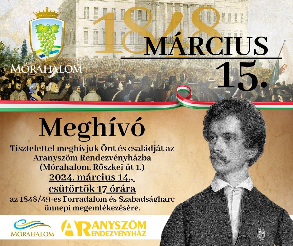 Tisztelettel meghívjuk Önt és családját az Aranyszöm Rendezvényházba 2024. március 14., csütörtök 17 órára az 1848/49-es Forradalom és Szabadságharc ünnepi megemlékezésére.