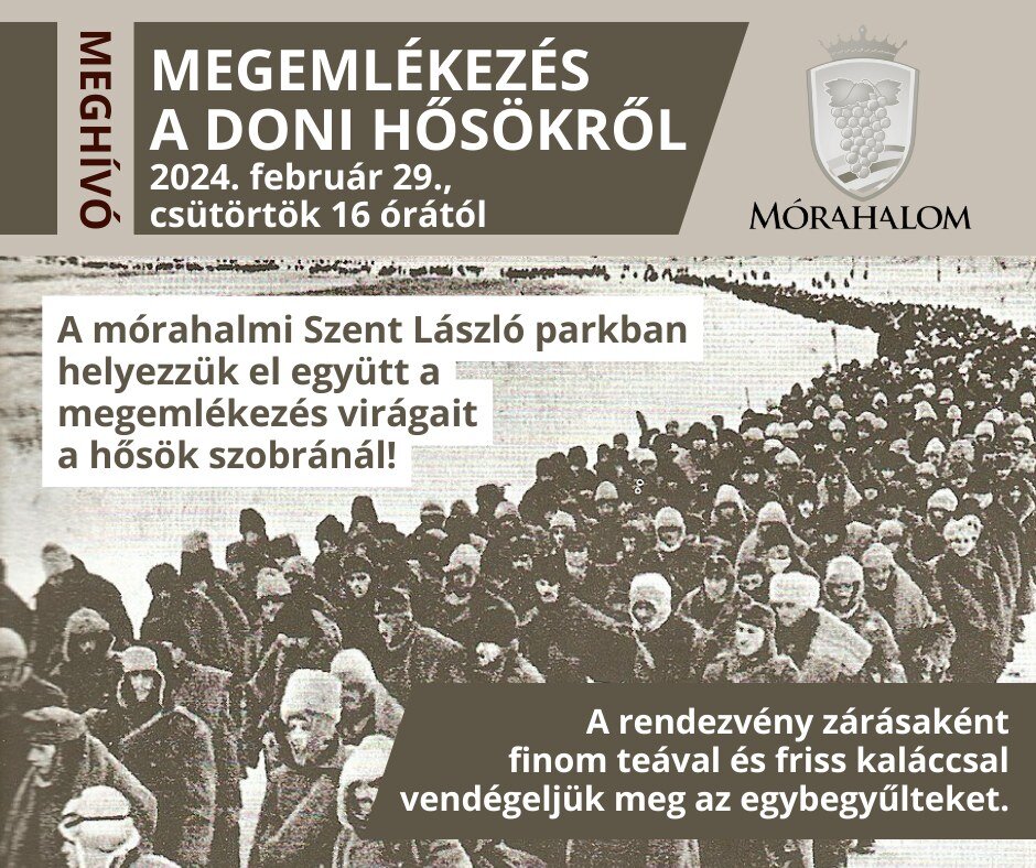 február 29., csütörtökön reggel indul a Doni emléktúra a szegedi Belvárosi temetőből, majd a domaszéki állomás után 16 órától, Mórahalmon koszorúzással emlékezünk a hősökre a Szent László parki háborús emlékműnél.