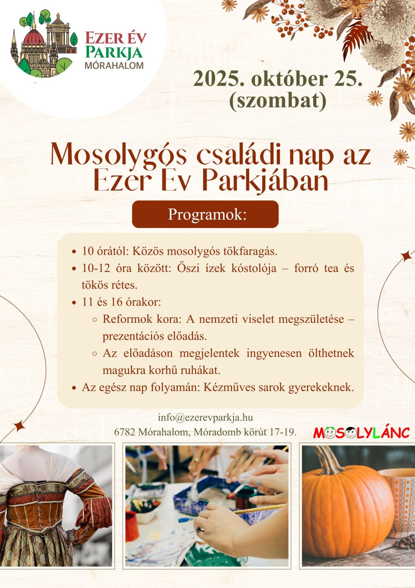 Október 25-én egy különleges, mosolygós családi napra hívunk benneteket: lesz közös tökfaragás , kézműveskedés , történelmi időutazás , kóstolók és egy mosolygós fotóverseny értékes nyereményekkel!