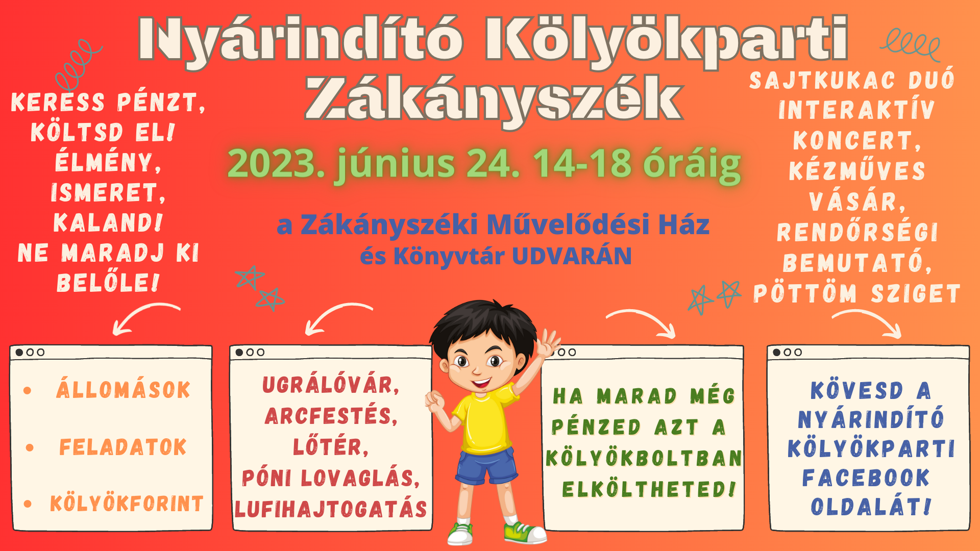 A Zákányszéki Művelődési Ház és Könyvtár ebben az évben harmadik alkalommal rendezi meg a Nyárindító Kölyökpartit 2023. június 24-én 14-18 óráig.