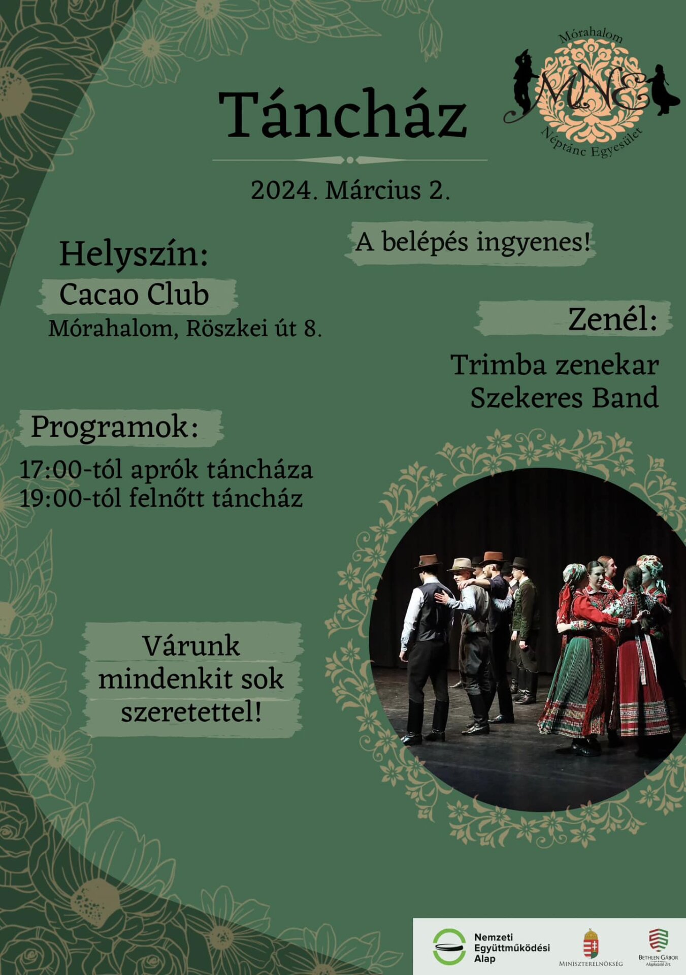 A Mórahalom Néptánc Egyesület táncházat rendez március 2-án, szombaton a Cacao Club-ban. Zenél a Trimba zenekar és a Szekeres Band.