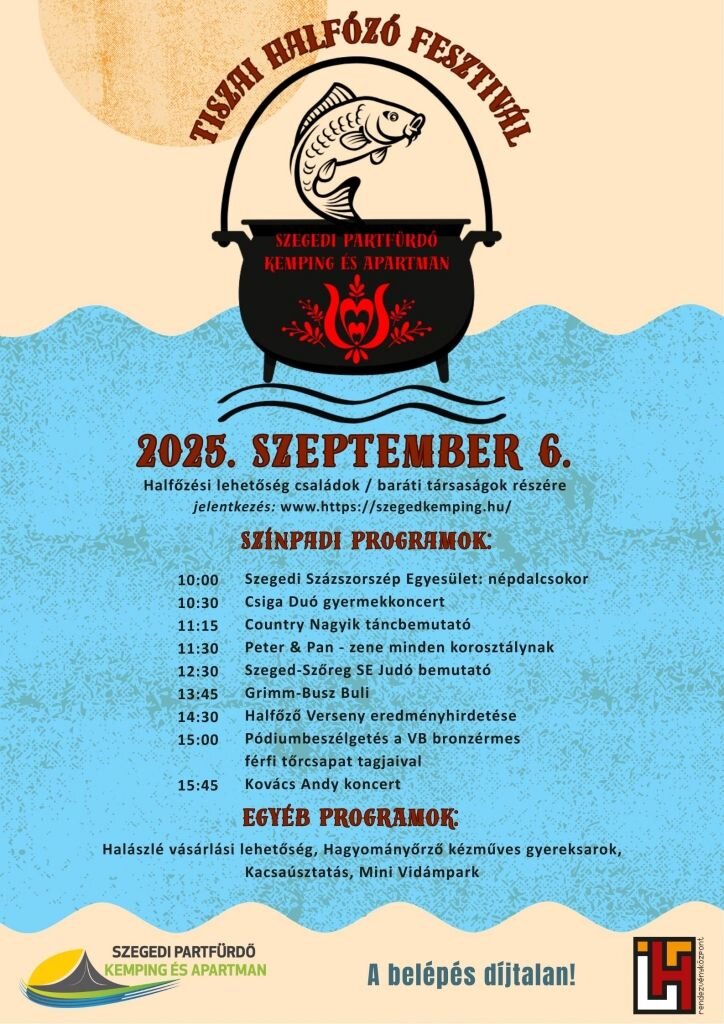 A Tiszai Halfőző Fesztivál szeptember 6-án várja az érdeklődőket a Szegedi Partfürdőn. A nevezők baráti hangulatú versenyen mutathatják meg halászléfőző tudományukat, várjuk a vállalkozó közösségek jelentkezését.