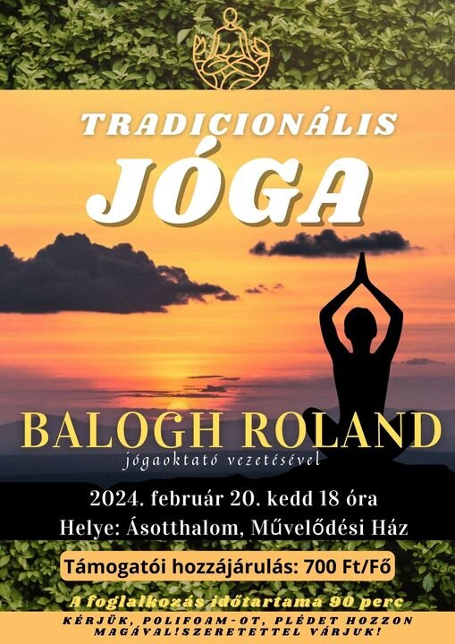 2024. február 20-án kedden este 18 órától a Művelődési Házban, Balogh Roland tradicionális jóga oktató várja a jóga kedvelőit.