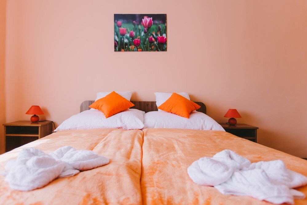 Két pótágyazható szoba (“narancs” és “zöld”) és két különálló (zuhanyfülkés) fürdőszoba, tágas, konyhával közös nappalival. A szobák pótágyazhatók, a konyha jól felszerelt, a kisgyerek(ek)kel érkezőknek további eszközöket (pl. kiságy, utazóágy, etetőszék, babakád) felár nélkül biztosítunk.