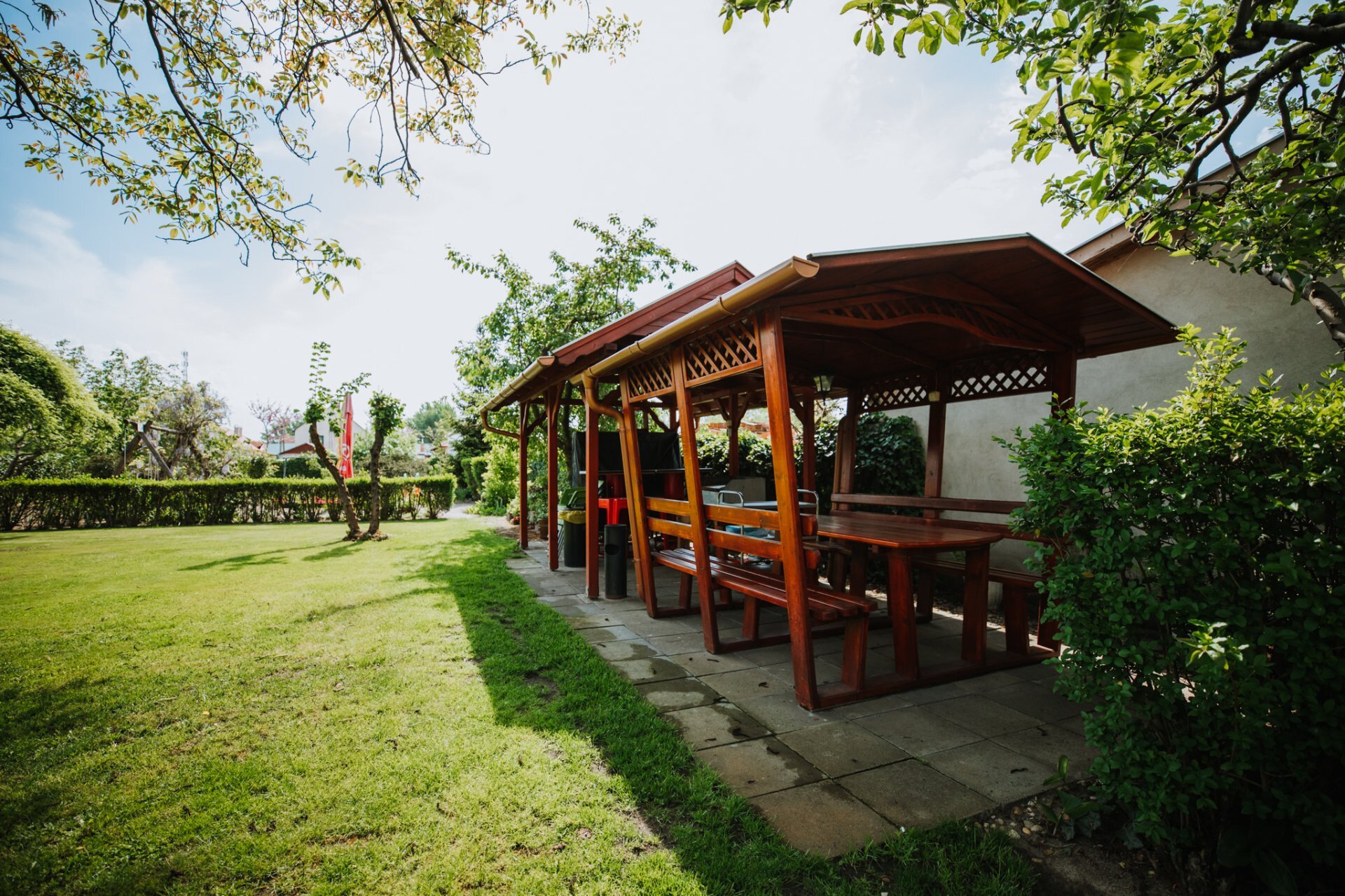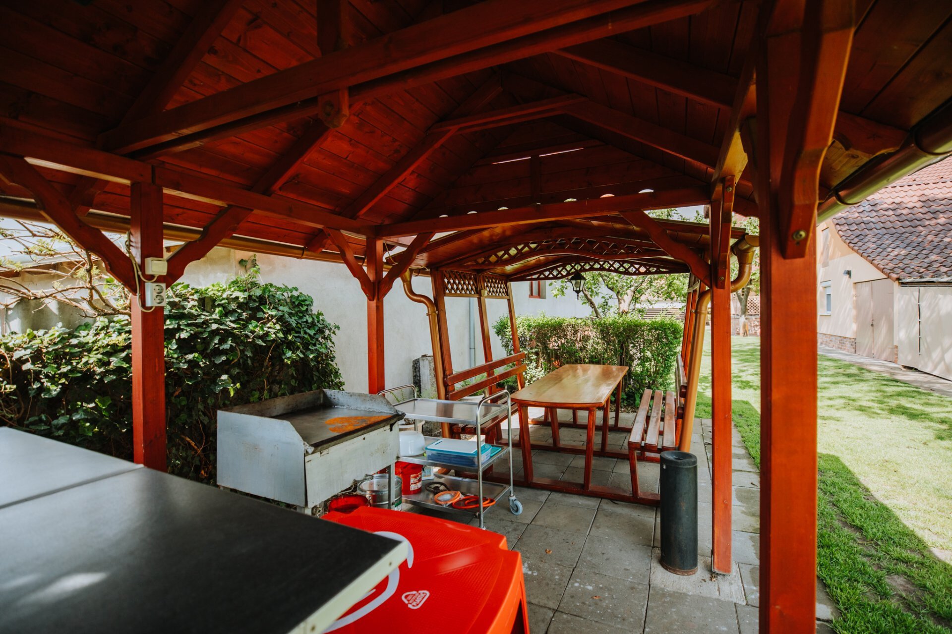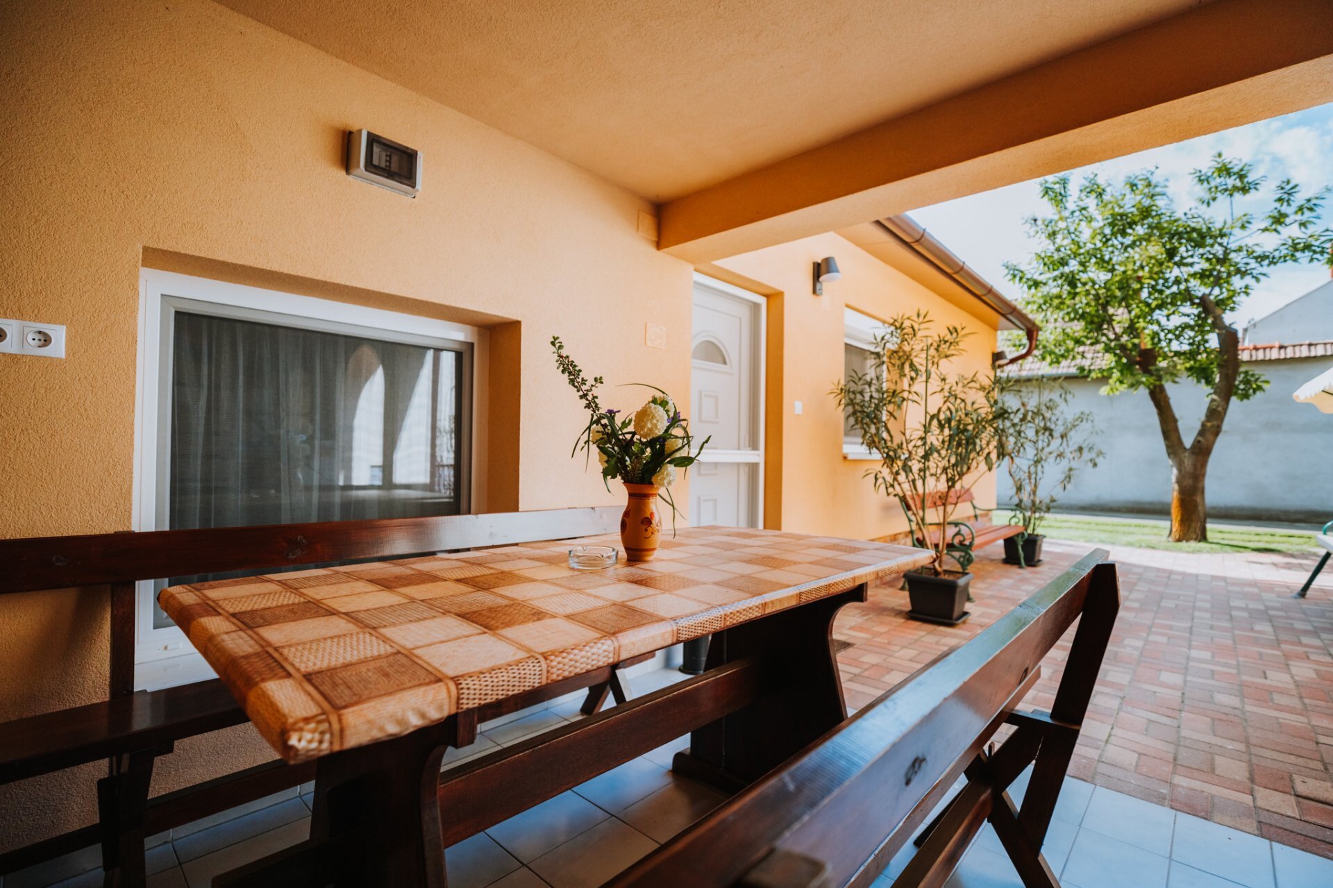 Apartman előtt fedett terasz (étkezőasztal, padok).