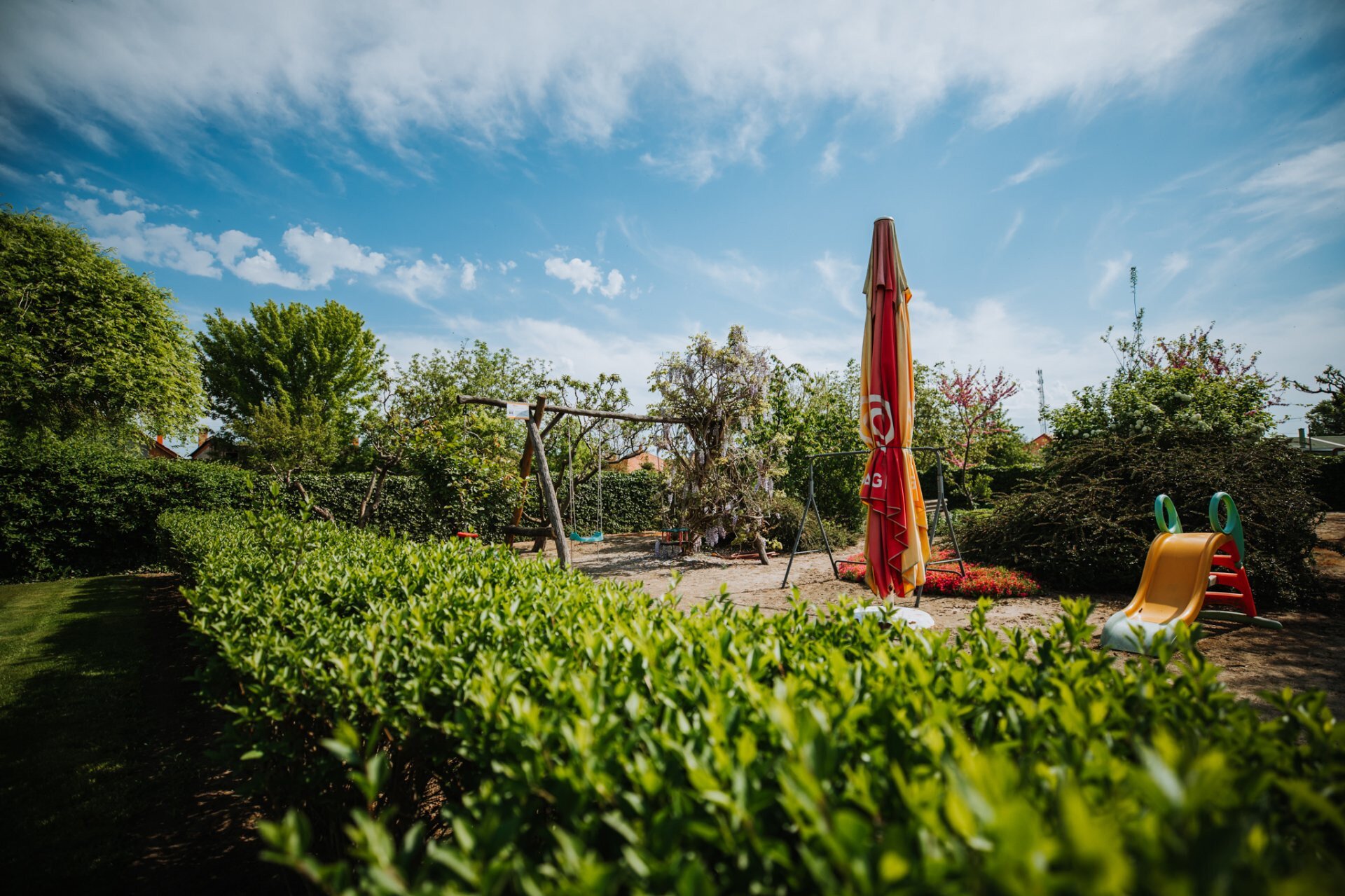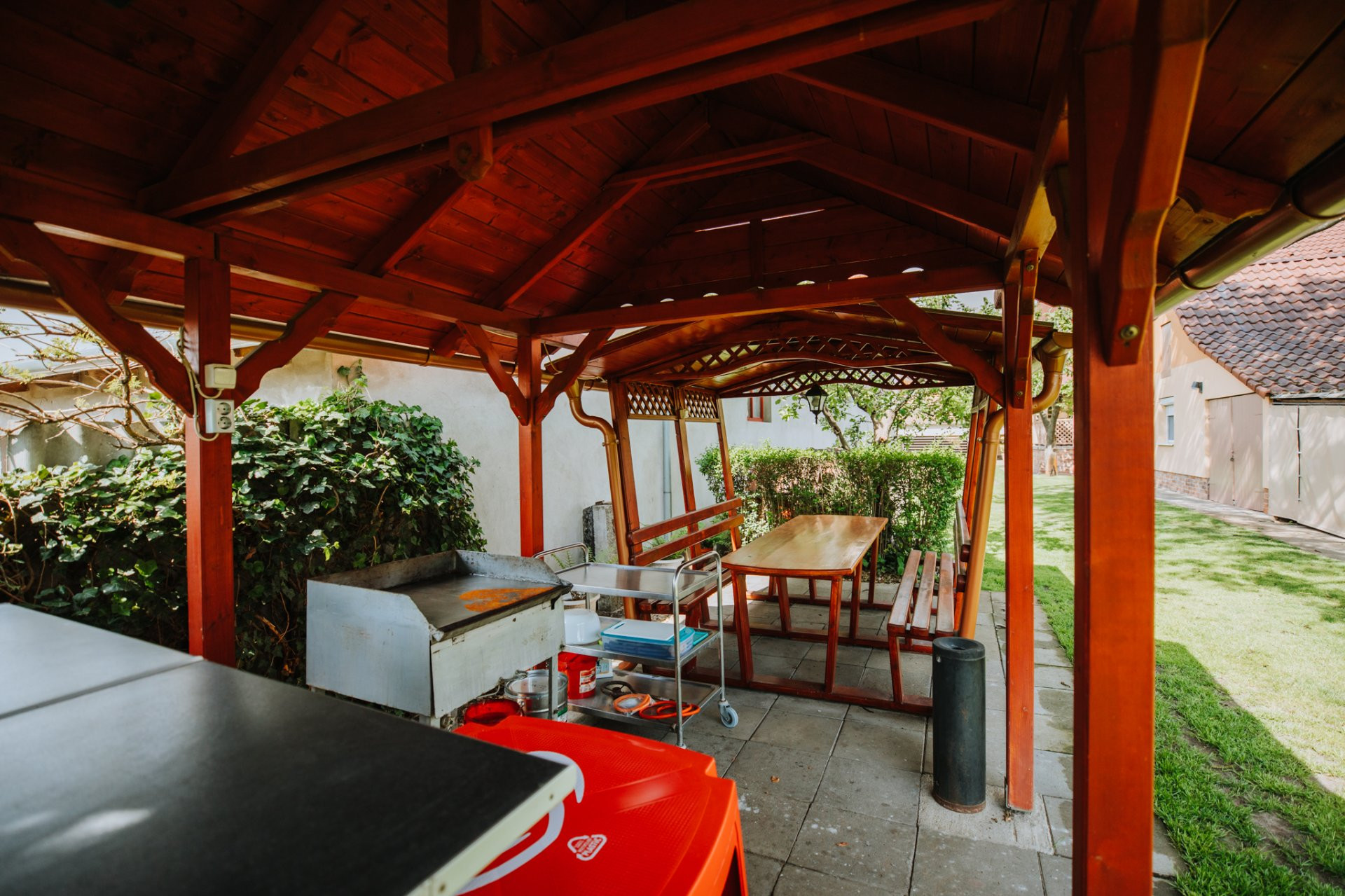 Zárt udvar, parkolás. Pihenőkert szaletlivel és grillezési bográcsozási lehetőséggel. Gyerek hinták, hintaágy, pihenőpadok.