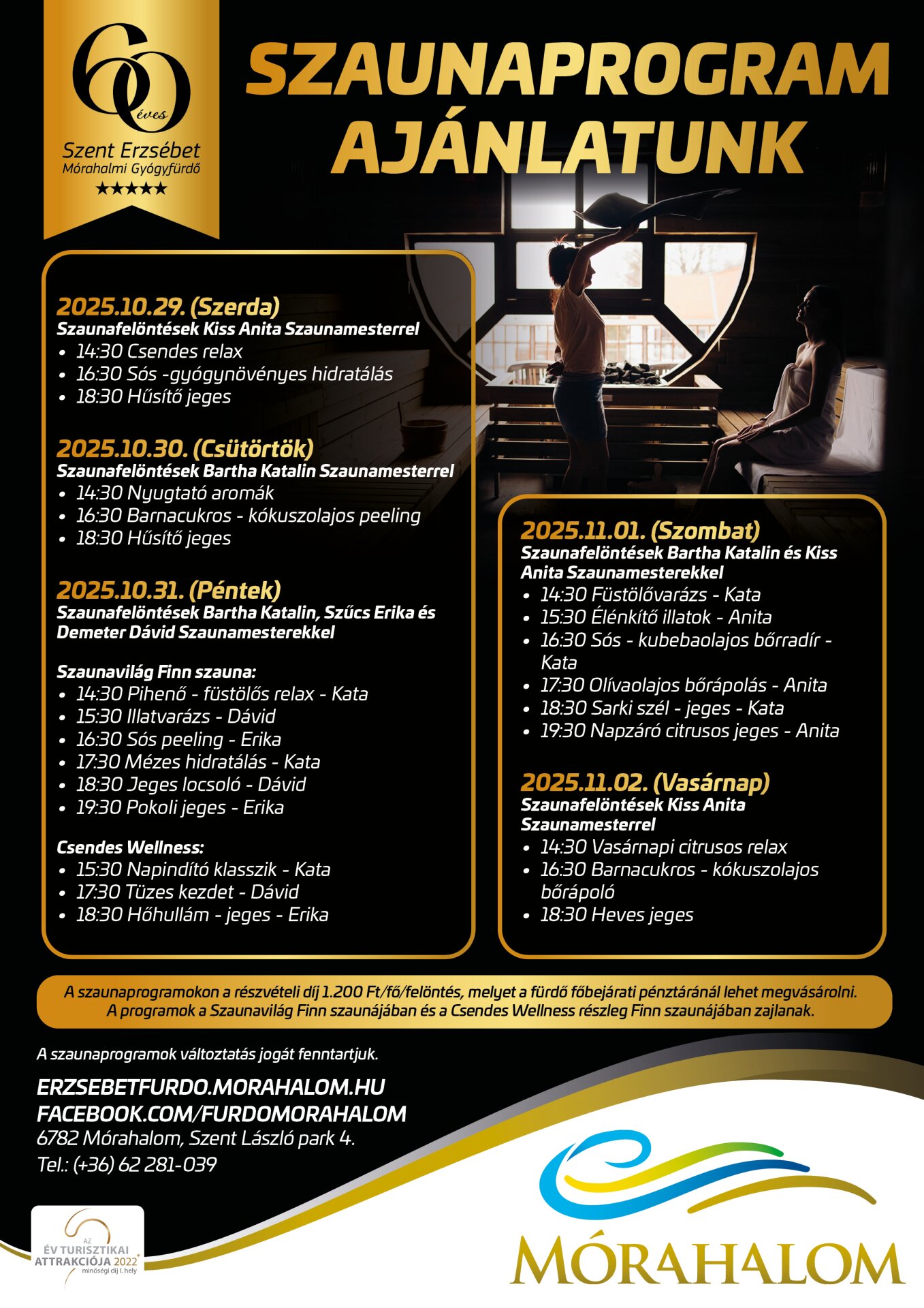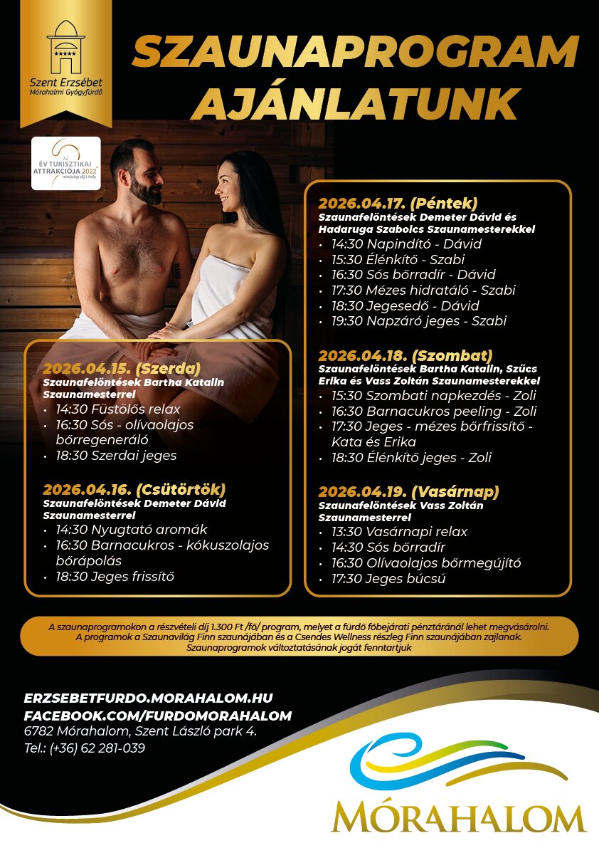 - A programok a Szaunavilág finn szaunájában és a Csendes Wellness Prémium Spa Area részleg Mesterszaunájában zajlanak.