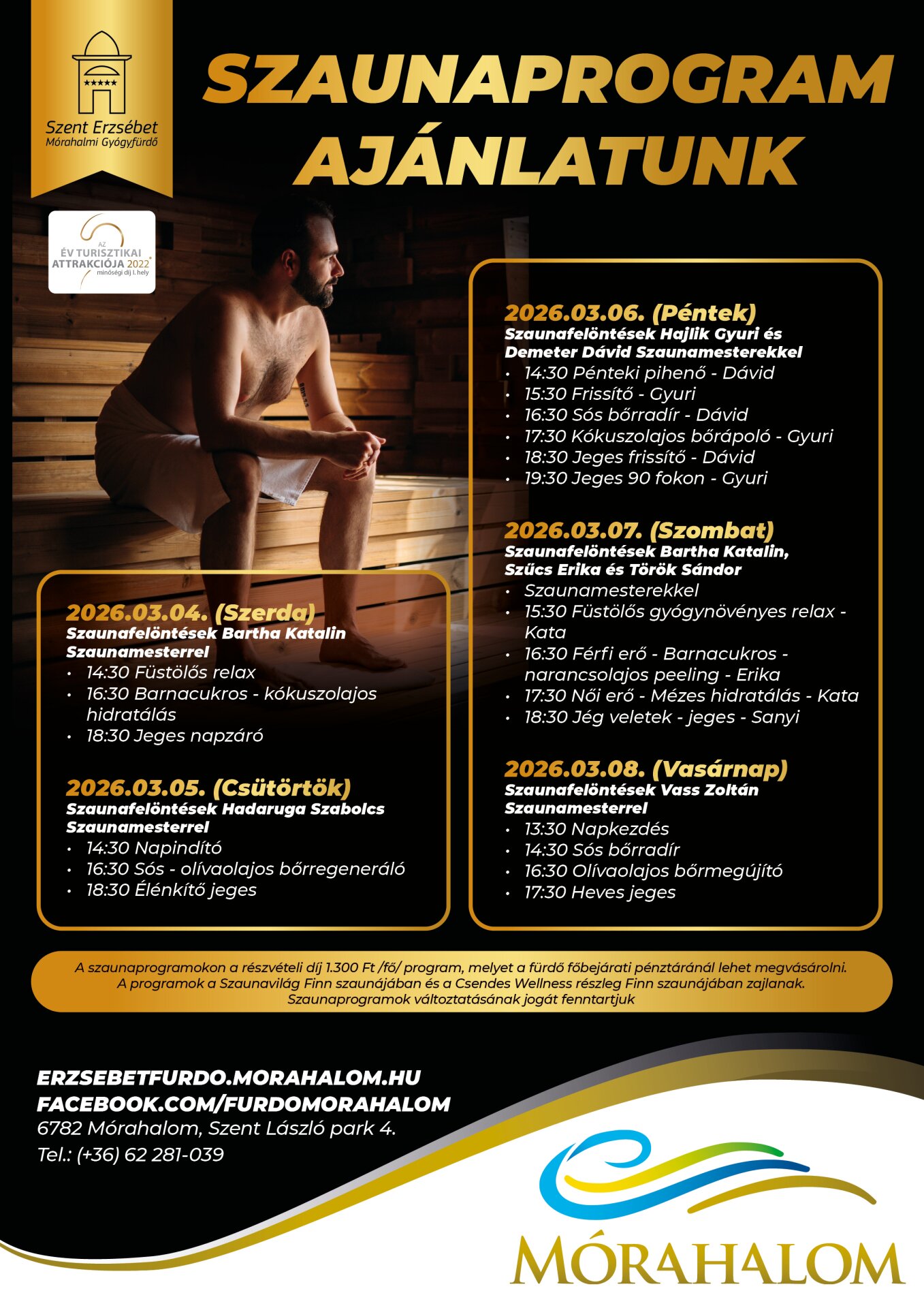 - A szaunaprogram jegyára 1300 Ft/ fő/ program, amelyet a fürdő főbejárati pénztáránál lehet megvásárolni!