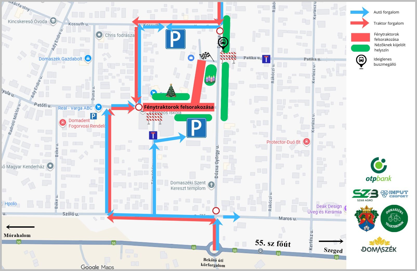 Tájékoztató térkép és figyelemfelhívás a vasárnapi Adventi ünnepség (december 14.) és fénytraktoros felvonulás rendezvényre vonatkozó FORGALMI és PARKOLÁSI rendről
