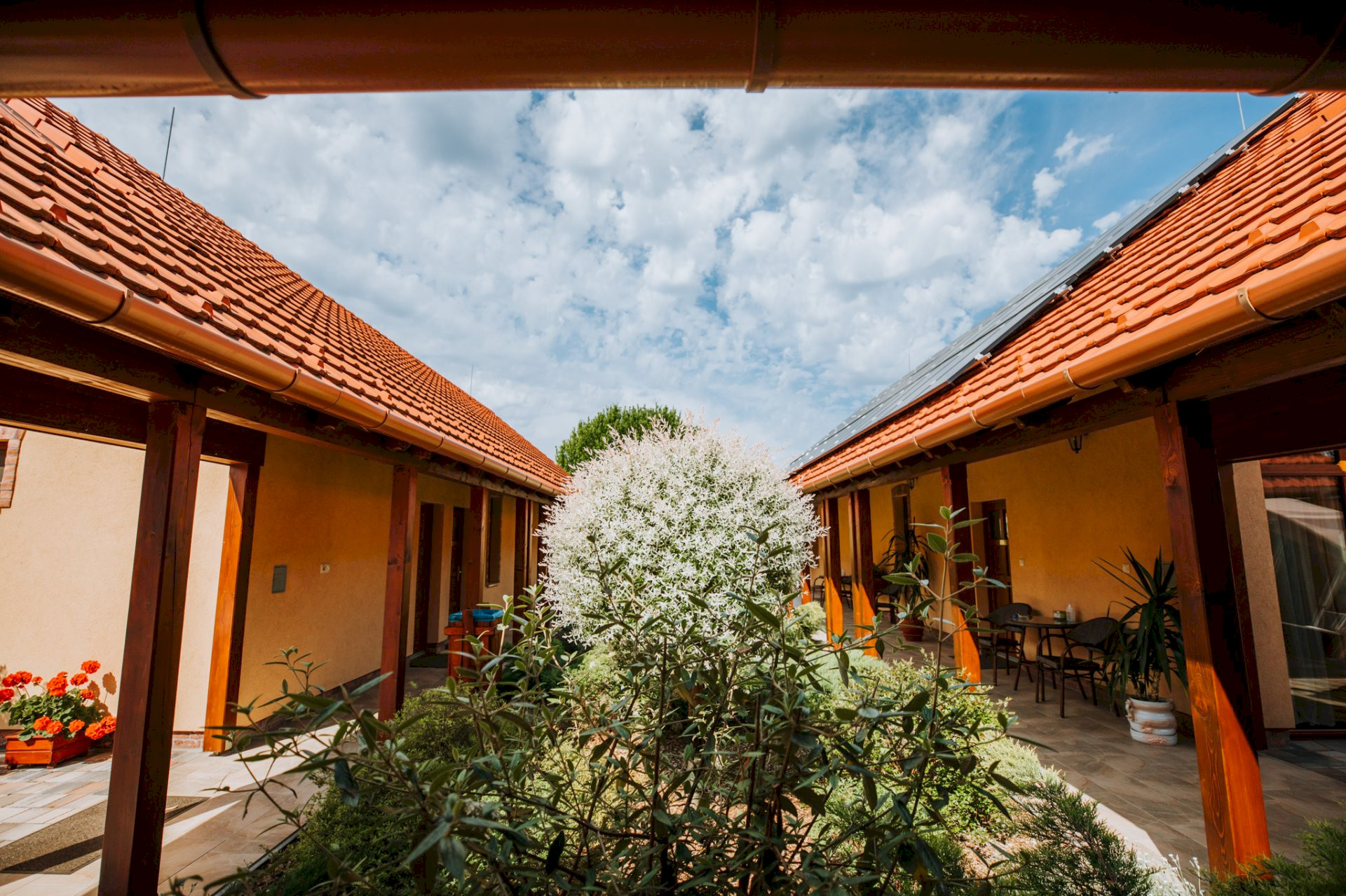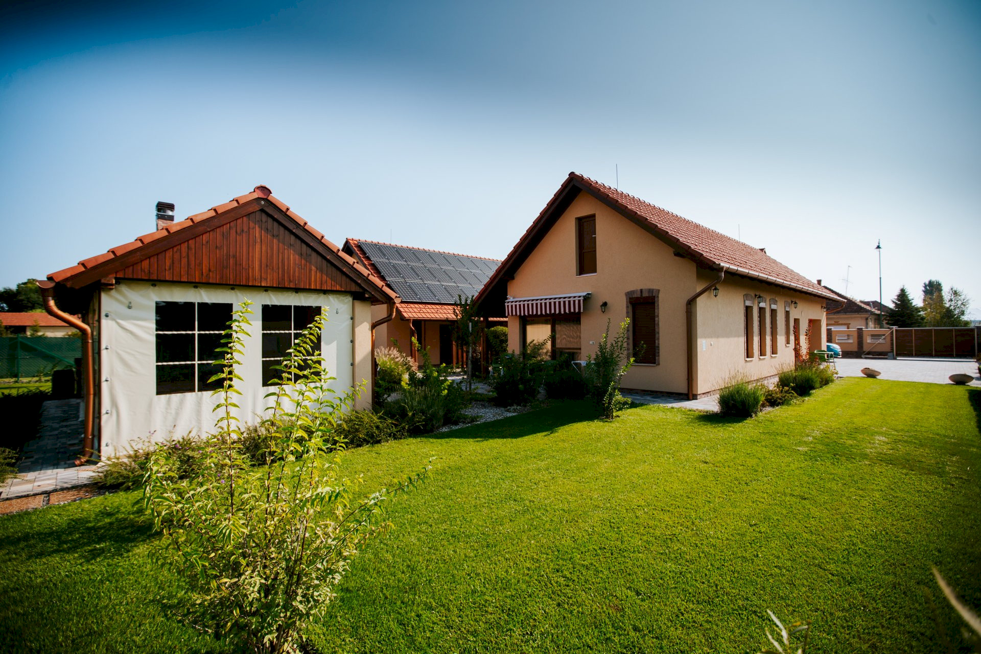 Svaki apartman ima natkrivenu terasu, zeleni deo za sedenje, uređeno dvorište i zatvoren parking. Baštenska zajednička prostorija sa roštiljem, kuvalo za vodu, pribor za kuvanje. Dečje igralište (tobogan, ljuljaške, gol za mali fudbal, koš za košarku, igralište u pesku).
